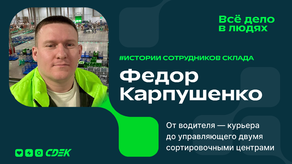 В СДЭК я с 2013 года: пришёл в отдел доставки водителем-курьером на пару месяцев, но остался надолго — компания покорила открытостью и ценностями. Сейчас управляю двумя сортировочными центрами в Санкт-Петербурге.