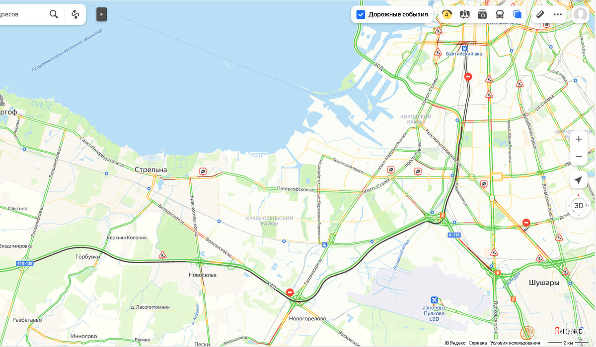 На юге Петербурга перекрыты ЗСД и часть КАД. Копятся пробки Автомобилисты сообщают о крупных перекрытиях на юге и юго-западе Петербурга. На кольцевой автодороге и подъездах к Западному скоростному диаметру копится транспорт. По данным «Яндекс.Пробок», днем 26 апреля перекрыли внешнее кольцо КАД на подъезде к ЗСД. Движение остановлено от Ропшинского шоссе. Также закрыты сам ЗСД от южной развязки с КАД до Благодатной улицы и Кубинская улица от Благодатной до Обводного канала в обе стороны. На внутреннем кольце КАД копится затор от Пулковского шоссе к ЗСД. По информации пользователей сервиса, в двух рядах стоят грузовики. Пробки растут на Предпортовой улице, Дачном проспекте, Волхонском и Красносельском шоссе на въезд на кольцевую, а также на Автомобильной улице в сторону заезда на ЗСД. Затор на Волхонском шоссе растянулся на 5,4 километра от Стрельны до КАД. В целом же по городу сейчас обычные 4 балла.
