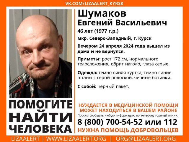 По данным волонтеров, пропал Шумаков Евгений Васильевич. Вечером 24 апреля он вышел из дома и не вернулся. Курянин нуждается в медицинской помощи. Требуется поддержка добровольцев в поисках.
