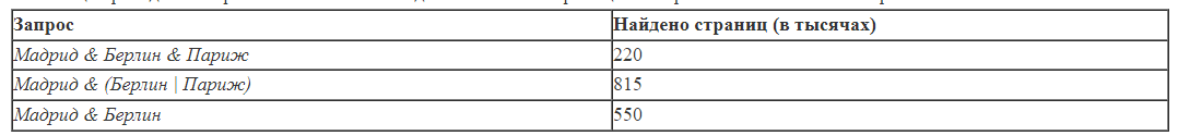 В языке запросов поискового сервера для обозначения логической операции «ИЛИ» используется символ «|», а для логической операции «И» –– символ «&». В таблице приведены запросы и количество найденных по ним страниц некоторого сегмента сети Интернет. Какое количество страниц (в тысячах) будет найдено по запросу Мадрид & Париж? Считается, что все запросы выполнялись практически одновременно, так что набор страниц, содержащих все искомые слова, не изменялся за время выполнения запросов. РЕШЕНИЕ Изобразим на диаграмме имеющиеся данные: Отметим область, которую нужно найти: Делаем вывод что: Мадрид И Париж = (Мадрид И (Берлин ИЛИ Париж)) - (Мадрид И Берлин) + (Мадрид И Берлин И Париж) = 815 - 550 + 220 = 485 ОТВЕТ 485