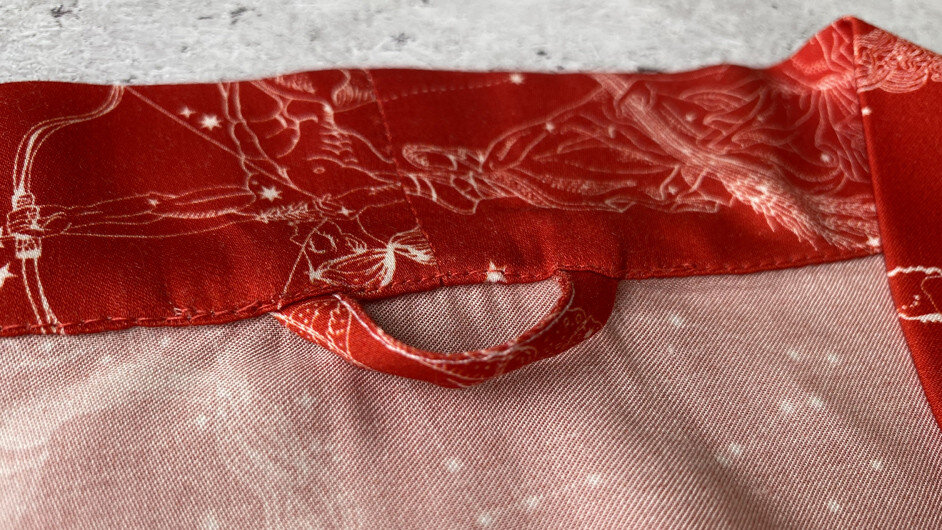 На прихватках традиционно петельки пришивают в уголке. Если вы шьёте прихватки самостоятельно, то петельку можно выполнить одновременно с обработкой косой бейкой открытых срезов.
