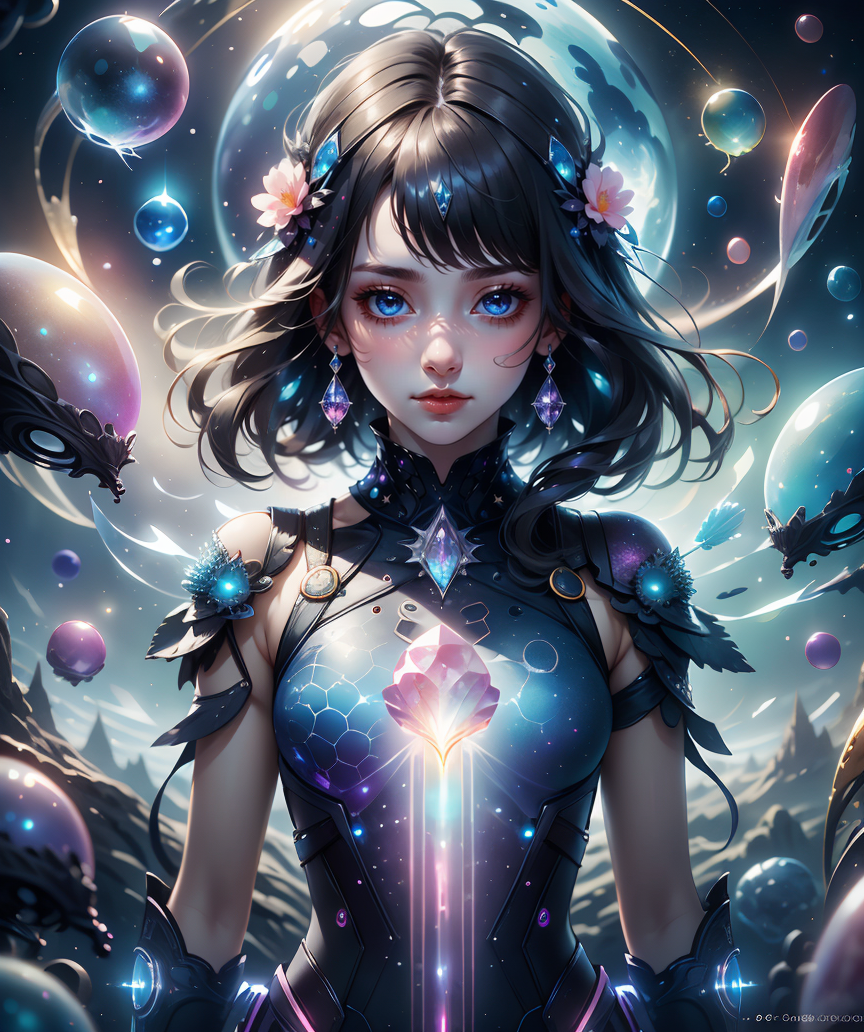 (высокое качество, шедевр, 8к), 1девушка, магия, блики, космос, украшения, драгоценные камни, кристаллы, <lora:Dreamwave v3:0.5>