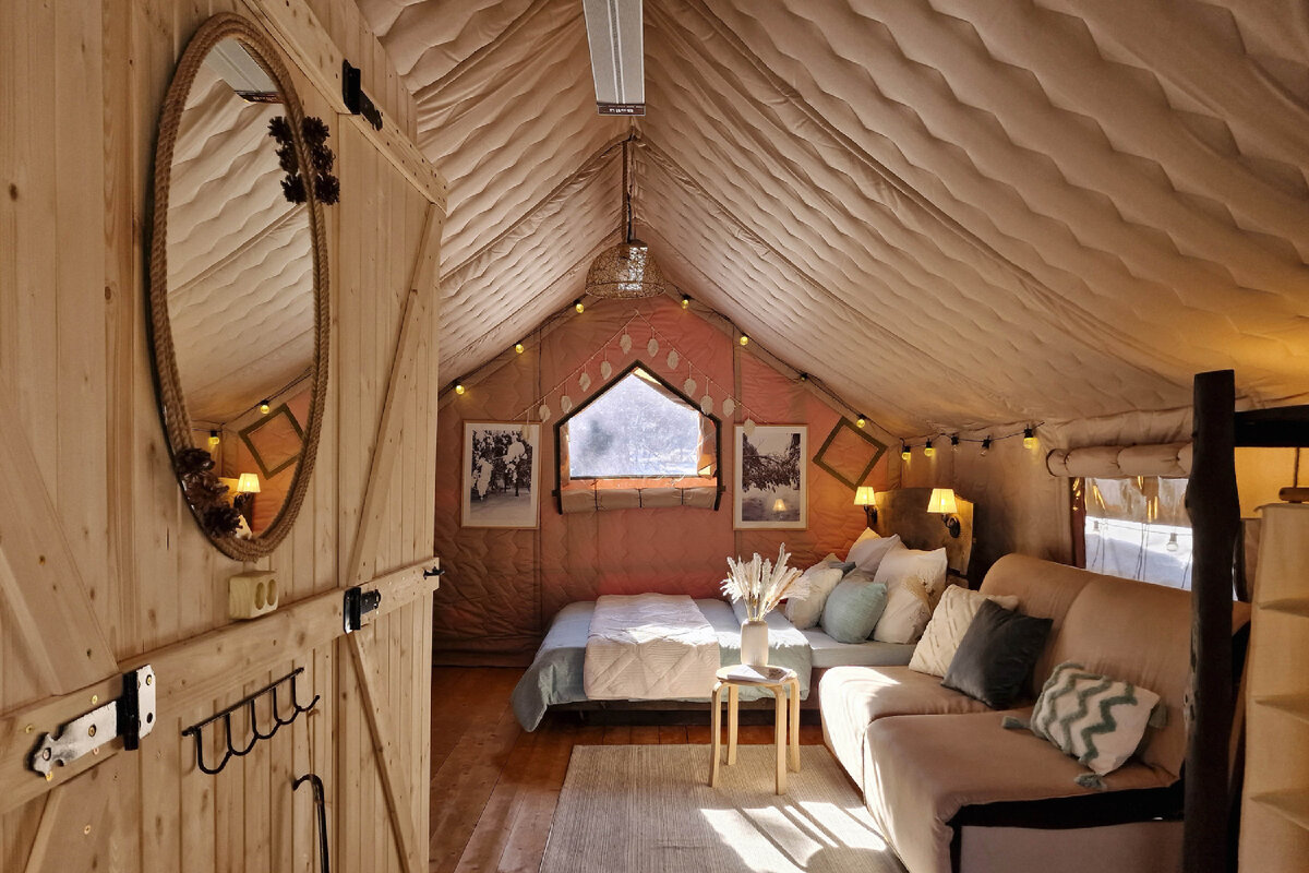 Как жить в палатках зимой? Для начинающих бизнес в сфере гостеприимства, это очень актуальный вопрос. 👉Рассказываем и показываем в этой статье. Сафари Тент, Фэмели Тент и Пати Тент утепляются внутренней палаткой. Мы их называем “палаткин пуховичок”. ✔️Стены и потолок зимней палатки представляют из себя сэндвич, который состоит из двух слоев смесовой ткани и холлофайбера. ✔️По лицевой стороне проходит красивая декоративная стяжка. ✔️Боковых окон в палатке нет, так как окно - это самое холодное место. Окно из прозрачного ПВХ предусмотрено в задней части палатки. Как крепится зимний модуль? “Палаткин пуховичок” просто крепится на карабины и петли, которые встроены в рёбра палатки в местах, где стена стыкуется с крышей. Алюминиевые трубки идут в комплекте. За счет них стены и потолок внутри зимнего модуля не провисают и не смещаются. Палатка внешне очень напоминает стёганое одеяло. Температурный режим ❄️При дополнительном обогреве в палатке комфортно до -20 С. Палатки отлично себя заре