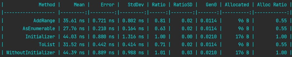 А вот мы решили создать List из уже существующего массива. Какой же способ выбрать, если нам важны наносекунды? Ответ: любой. Но если наносекунды нам действительно важны, то мы будем выбирать передачу массива в конструктор List'a. Внутри есть попытка каста IEnumerable к ICollection, что позволяет создать внутренний массив нужного размера. Именно его расширение является замедляющим фактором и причиной аллокации при вызове банального метода Add. Инициализатор, конечно же, является синтаксическим сахаром многократного вызова метода Add (это отчётливо видно в IL). Мой канал в TG: https://t.me/csharp_gepard