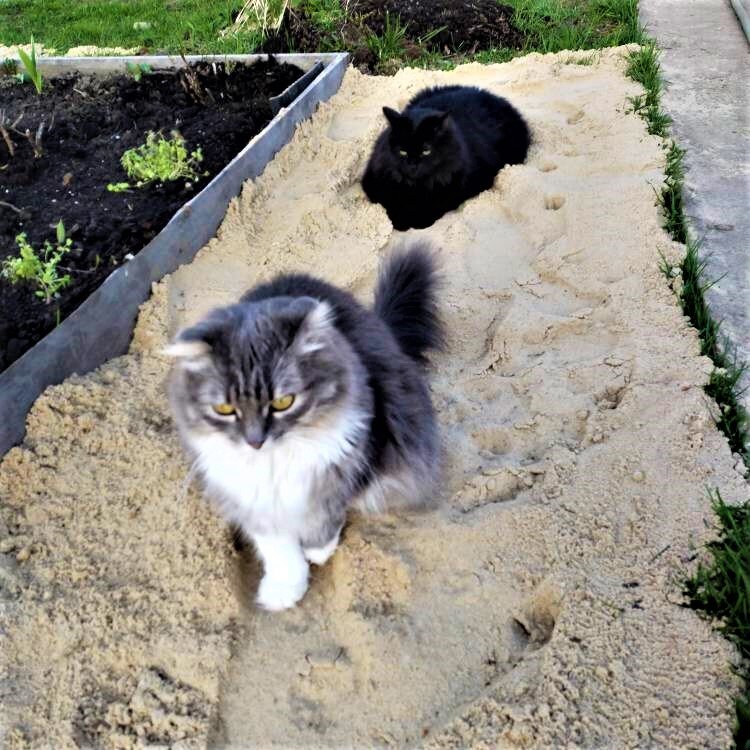 Сегодня Сашка начал засыпать низины на участке, образовавшиеся после весенних затопов, песком. Мы специально купили КАМАЗ песка, чтобы потихоньку поднимать участок. Наши соседи голубки - изначально вбубухали несколько машин, для подъема почвы. И нас начало подтапливать. Уткам, конечно, хорошо, но нам с кошками не очень. Я наплевала на газон - дело наживное. Поднимем участок, насыпем слой чернозёма и потом новый газон посею. Фигня! Но кошки!!!