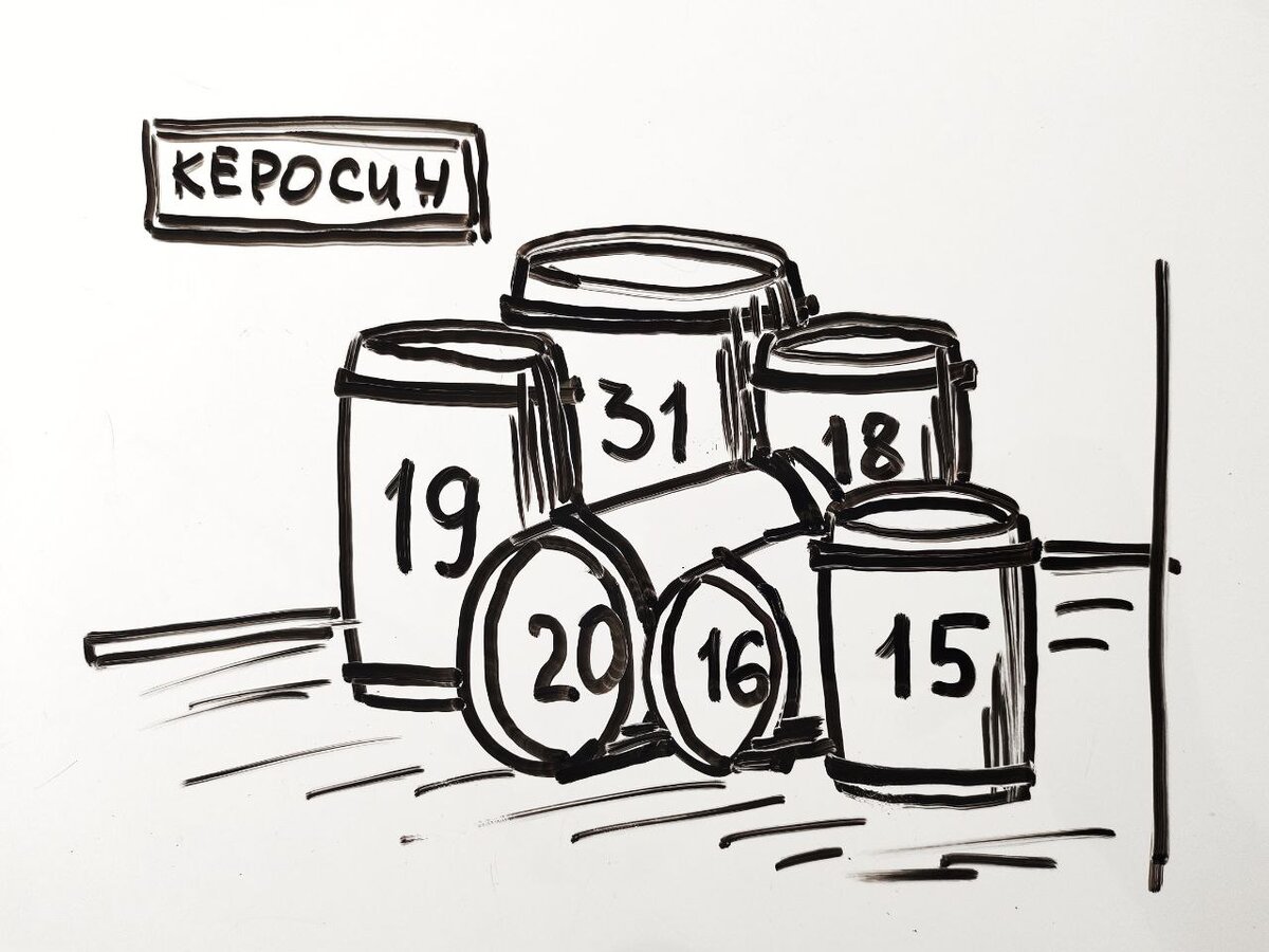 Это задача из советского сборника головоломок 1950 года. Её прелесть в том, что решить её может даже учащийся начальной школы, но в то же время она заставляет задуматься и взрослых. Если сможете решить за 2 минуты, значит, вы в хорошей форме. В магазин поступило 6 бочек разного объёма с керосином. На картинке изображён объем каждой бочки в вёдрах: 31, 20, 19, 18, 16, 15. В первый день купили две бочки керосина, во второй день — три, причём во второй день купили в 2 раза больше керосина, чем в первый. Раскупоривать бочки не пришлось. Какая бочка осталась непроданной? Остановитесь, порешайте пару минут самостоятельно, пишите в комментариях своё решения, а ниже я приведу вам свои рассуждения. Решение Общий объём бочек: 31+20+19+18+16+15= 119 ведер. Одна бочка должна остаться, а остальной объём должен делиться на 3 части, так как во второй день купили в два раза больше керосина, чем в первый. Прикидываем, какая бочка может остаться. ❌Если останется 15-ведерная бочка, тогда оставшийся объё