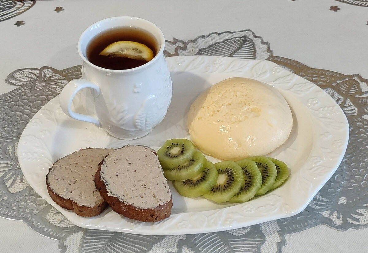 Омлет из микроволновки, два тоста из моего любимого хлеба, намазанные муссом из форели с дижонской горчицей, киви и чай с лимоном и сахзамом.