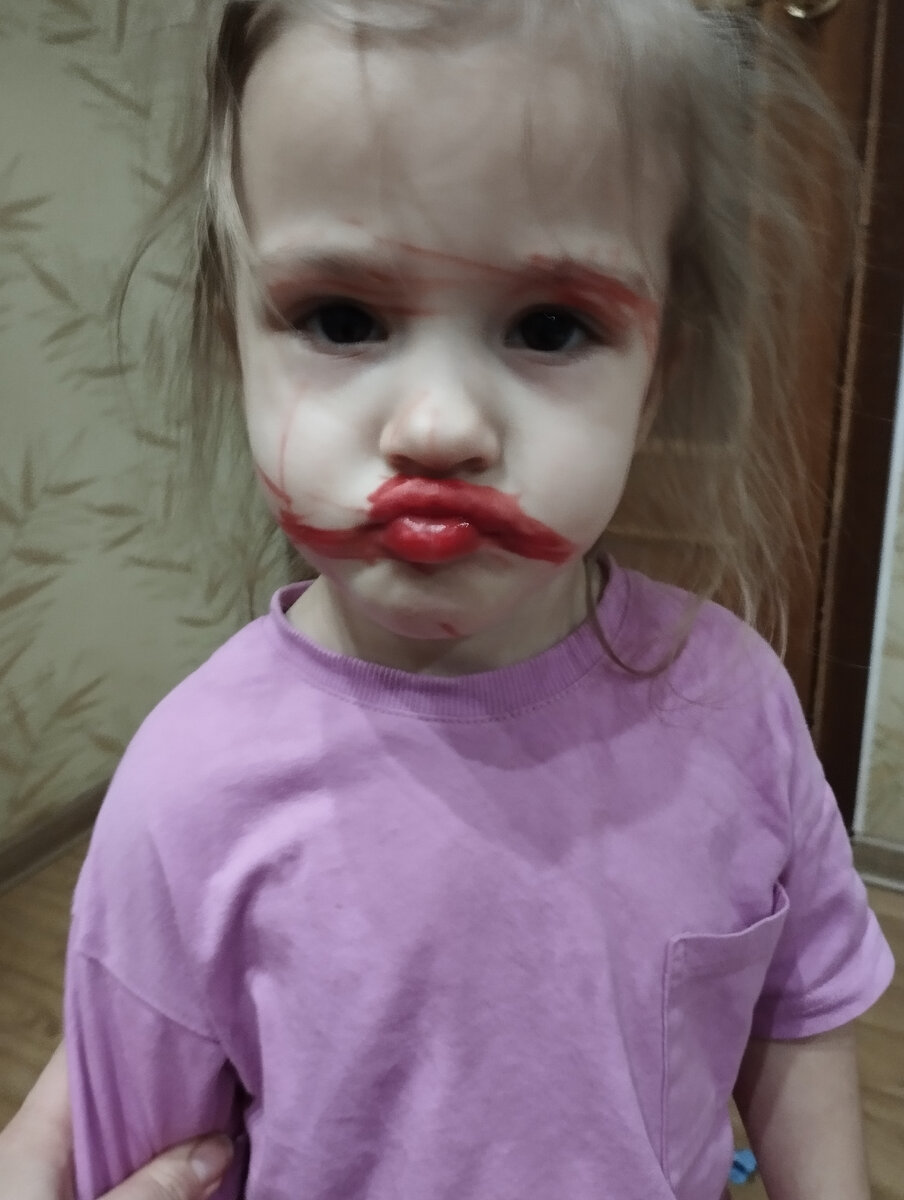 Доброе утро дорогие друзья. Я не могла этим не поделиться. Вот она цена пяти минут тишины матери. Я просто вчера вечером вышла буквально минут на 5-10 на кухню сделать этой красотке ужин 🫣 Захожу обратно в комнату , а тут такое... Это фломастер , мы днём рисовали, все убрали, а этот видимо упал со столика и я его не заметила 🤷 Ну и в общем захожу я в комнату , а тут такое чудо , говорит мне "Мама я принцесса" я чуть не упала. Простите , но как по мне это очень смешно, она ещё начала эти губы так как на фото делать. Я сначала минут пять тихо в уголке умирала от смеха, потом пошли отмывать, и конечно как назло фломастер оказался очень стойким , да тут ещё я решила уже раз ситуация есть, надо выжать из нее максимум. В итоге папу вернувшегося с работы встречала дочь с прекраснейшим собственноручно сотворенным макияжем и фразой "Папа, мы с девочками в клуб"... Папа где стоял там и сел 😀 Будем считать , что у папы прошла репетиция того , что будет через ...надцать лет😀 Спасибо , что