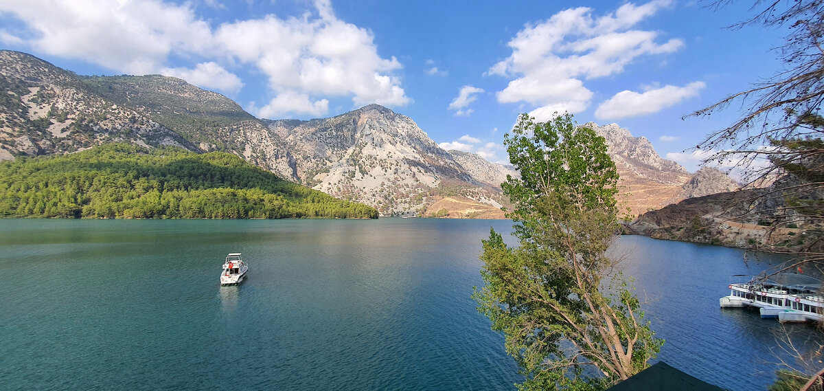 Вернемся в Аланию! Быть в Турции, арендовать автомобиль и не поехать посмотреть на красивое место среди гор - Грин Каньон в Манавгате - это не про нас! С утра наплавались на пляже Клеопатра в Алании и поехали с детьми изучать местность! Грин Каньон в Манавгате - самое большое искусственное водохранилище Турции. Оно находится в хорошо знакомом для многих русских туристов Средиземноморском регионе, между Аланьей и Антальей. Территория Каньона признана национальным парком. Каньон появился как результат строительства ГЭС. Мощную дамбу на реке Манавгат строили почти сеть лет и открыли в 1984 году. На тот момент это была третья по величине дамба в Турции и самое крупное высокогорное сооружение страны. Для создания гидроэлектростанции пригласили швейцарских специалистов. Было построено 4 турбины, каждая из которых способна давать мощность в 135 МВт. Одним из главных потребителей этой энергии выступает алюминиевый комбинат в Сейдишехире. Площадь водохранилища Грин Каньон весьма внушительна