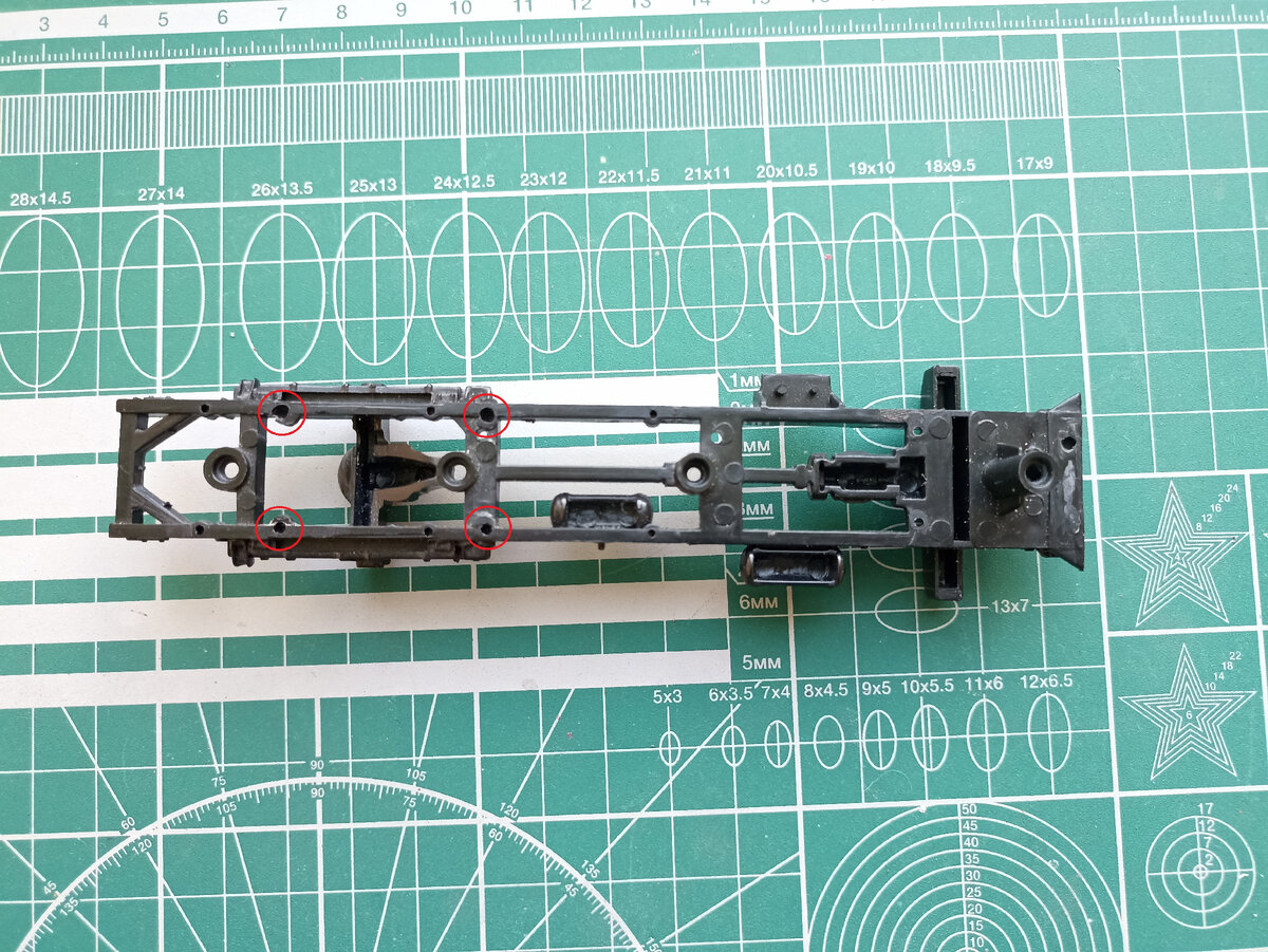 Рассмотрим раму подробней и сравним её с более ранней версией, в которой не было упрощений. В данном случае это будет рама из набора «AVD», упрощенная же рама от журнального варианта модели ЗСК-10,0. С неё сняты все детали, которые не были отлиты с ней заодно. Сразу стоит отметить, что упрощенная рама подверглась небольшим доработкам, на ней были сделаны отверстия для надрамников от более ранних надстроек, эти отверстия отмечены на фото ниже. Других изменений в конструкцию рамы не вносилось.
