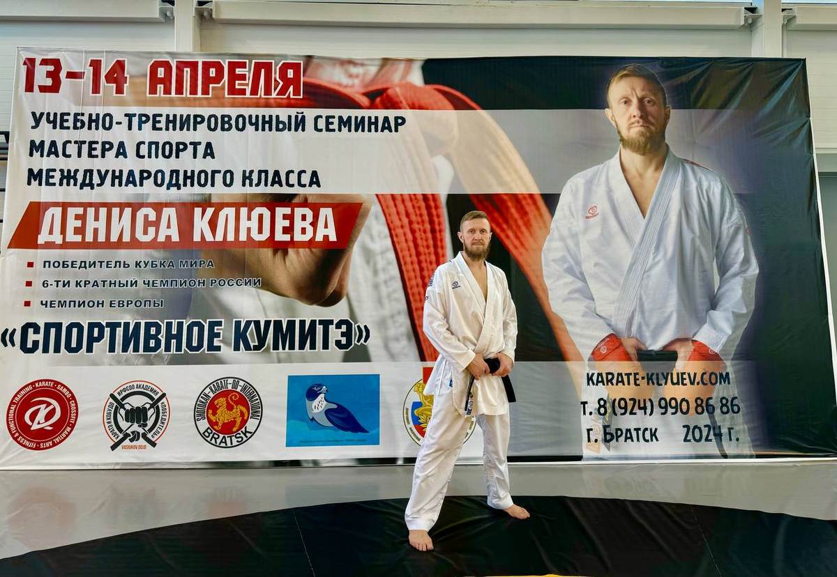 13-14 апреля в городе Братске Иркутской области прошел первый семинар по спортивному кумитэ под руководством Дениса Клюева. Денис Клюев: «Организатором мероприятия выступил мой товарищ и друг, Васюков Денис Александрович. Этот семинар планировался уже, наверное, года два, и никак не получалось организовать его по ряду обстоятельств, но в этом году мы в очередной раз провели переговоры, и, наконец, семинар состоялся.Я приехал в Братск заблаговременно. Ребята свозили меня на экскурсию на местную Братскую ГЭС – одну из трех крупнейших в России. Вот, удалось побывать на местных городских достопримечательностях! Также отмечу очень теплый прием, вкусное застолье и, конечно же, баню!» Денис Клюев: «Сам семинар проходил два дня по три тренировочных блока ежедневно. Все спортсмены были разбиты на две группы. Сначала – младшие дети, потом – старшие, инструкторы вместе со старшими спортсменами. То, что тренировались и инструкторы – это очень приятно. Очень позитивно! Видно, что тренерский состав
