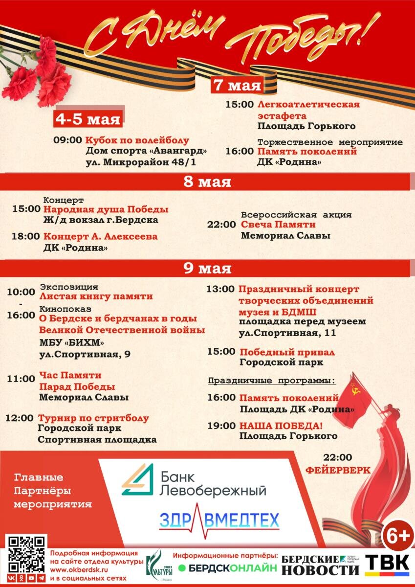 Близится памятная для нашей страны дата – День Победы советских солдат над фашистскими захватчиками – 9 Мая. Бердск-Онлайн уже сообщал, что традиционная акция «Бессмертный полк» в этом году пройдет в онлайн-формате. В Бердске подготовлен ряд мероприятий, которые состоятся в обычном режиме. Каждый сможет выбрать то, что ему нравится и провести праздничный досуг. 4-5 мая 9:00 Кубок по волейболу. Место проведения: дом спорта «Авангард» (ул. Микрорайон 48/1). 7 мая 15:00 Легкоатлетическая эстафета. Место проведения: площадь Горького. 16:00 Торжественное мероприятие «Память поколений». Место проведения: ДК «Родина», большой зал. 8 мая 15:00 Концерт «Народная душа Победы». Место проведения: железнодорожный вокзал г.Бердска. 18:00 Концерт композитора, музыканта, исполнителя А.Алексеева. Место проведения: ДК «Родина», большой зал. 22:00 Всероссийская акция «Свеча памяти». Место проведения: парк Победы. 9 мая. Афиша Дня Победы в Бердске 10:00-16:00 Экспозиция «Листая книгу памяти» и Кинопоказ «