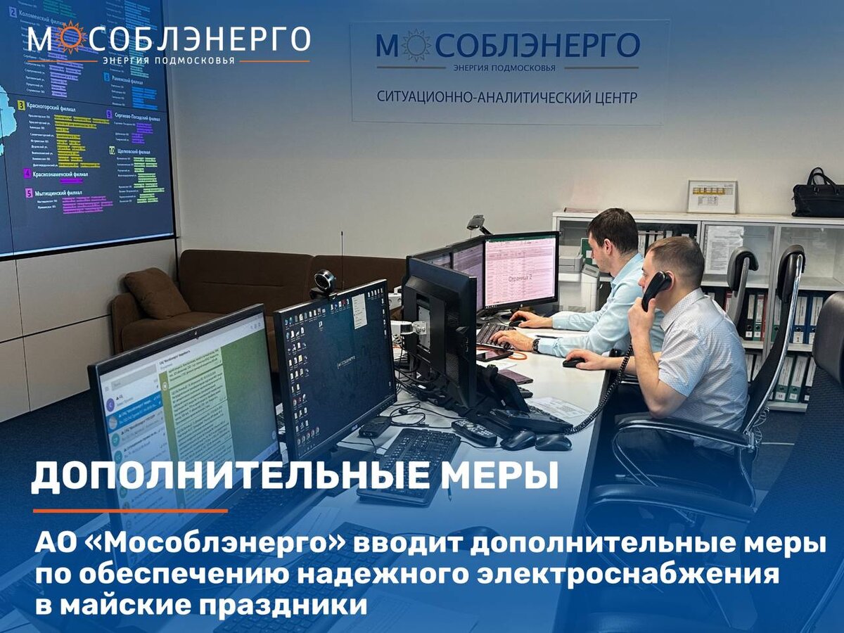 АО «Мособлэнерго» вводит дополнительные меры по обеспечению надежного электроснабжения потребителей Подмосковья в майские праздники. В периоды с 28 апреля по 2 мая и с 9 по 13 мая 2024 года запланирована организация круглосуточного дежурства руководителей компании, оперативного и оперативно-ремонтного персонала предприятия.