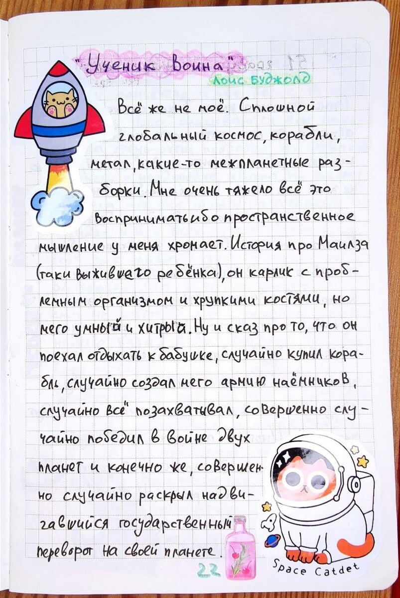 «Ученик воина» Лоис Буджолд Всё же не моё. Сплошной глобальный космос, корабли, метал, какие-то межпланетные разборки. Мне очень тяжело всё это воспринимать ибо пространственное мышление у меня хромает. История про Маилза (таки выжившего ребёнка), он карлик с проблемным организмом и хрупкими костями, но мего умный и хитрый. Ну и сказ про то, что он поехал отдыхать к бабушке, случайно купил корабль, случайно создал мего армию наёмников, случайно всё позахватывал, совершенно случайно победил в войне двух планет и конечно же, совершенно случайно раскрыл надвигавшийся государственный переворот на своей планете.