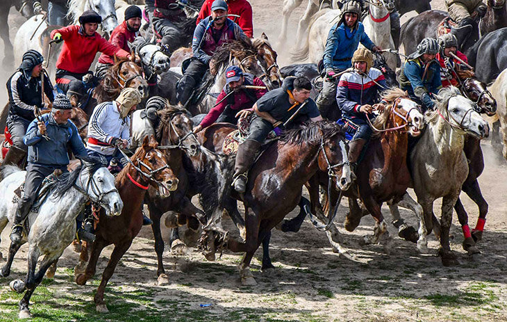 Хаотичное зрелище: мужчины в шлемофонах скачут на большом поле. Но наездников так много, что пространства между ними почти нет, и, кажется, тут не далеко до массовой давки. Еще эти мужчины бьют хлыстом лошадей соперников и наклоняются к земле, чтобы схватить обезглавленную и потрепанную тушу козла. Цель – дотащить ее до ворот, казана или начерченного мелом на земле круга.