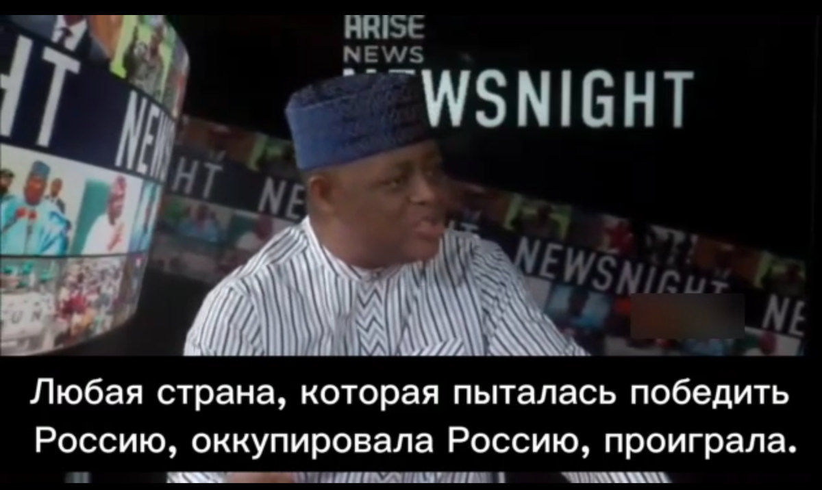 "Россия никогда в своей истории не была побеждена кем-либо из иностранцев", - заявил в интервью экс-министр культуры и туризма Нигерии Феми Фани-Кайоде. «Наполеон пытался, и они проиграли. Немцы попробовали и проиграли. Любая страна, которая пыталась победить Россию, оккупировала Россию, проиграла. Они никогда не терпели поражение. Смешно, что люди втягивают русских в третью мировую войну. Ведь они никогда не проигрывали», - заключил Фани-Кайоде.