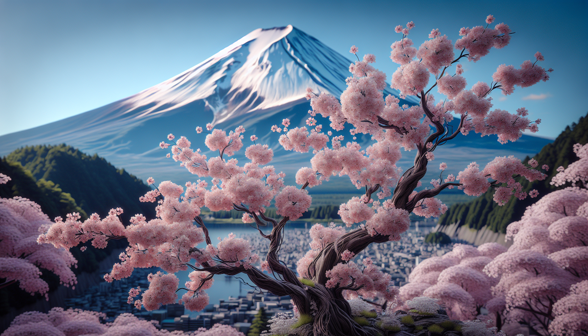 цветение сакуры, изогнутые деревья, миниатюрный японский садик, беседка, на фоне гора Фудзи, картина в стиле Айвазовского