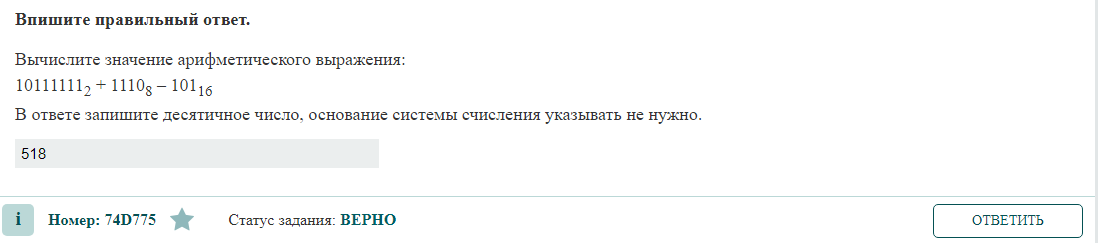 Вычислите значение арифметического выражения: 10111111₂ + 1110₈ – 101₁₆ В ответе запишите десятичное число, основание системы счисления указывать не нужно. ЧТО НУЖНО ЗНАТЬ? Правила перевода из двоичной системы счисления в десятичную Для того, чтобы перевести из 2-й в 10-ю необходимо умножить каждую цифру двоичного числа на основание “2”, возведенное в степень, равную разряду. Например, число 101₂= 1*2²+0*2¹+ 1*2⁰= 4+0+1= 5₁₀. Перевод из восьмеричной системы в десятичную Для этого необходимо умножить каждую цифру восьмеричного числа на основание «8», возведенное в степень, равную разряду числа и после этого сложить полученные результаты. Например, число 101₈= 1*8²+0*8¹+ 1*8⁰= 64+1= 65₁₀. Перевод из шестнадцатеричной системы в десятичную Для этого необходимо умножить каждую цифру шестнадцатеричного числа на основание «16», возведенное в степень, равную разряду числа и после этого сложить полученные результаты. Например, число 101₁₆= 1*16²+0*16¹+ 1*16⁰= 256+1= 257₁₀. РЕШЕНИЕ 10111111₂=1*2