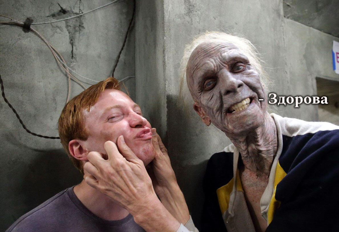 Оказалось, что нарушители — это местные. Там более-менее молодой мужик в потной майке и слепой дед в жутковатой кожаной маске. Дед будет молиться на какой-то древний бункер, оставшийся со Второй мировой.
