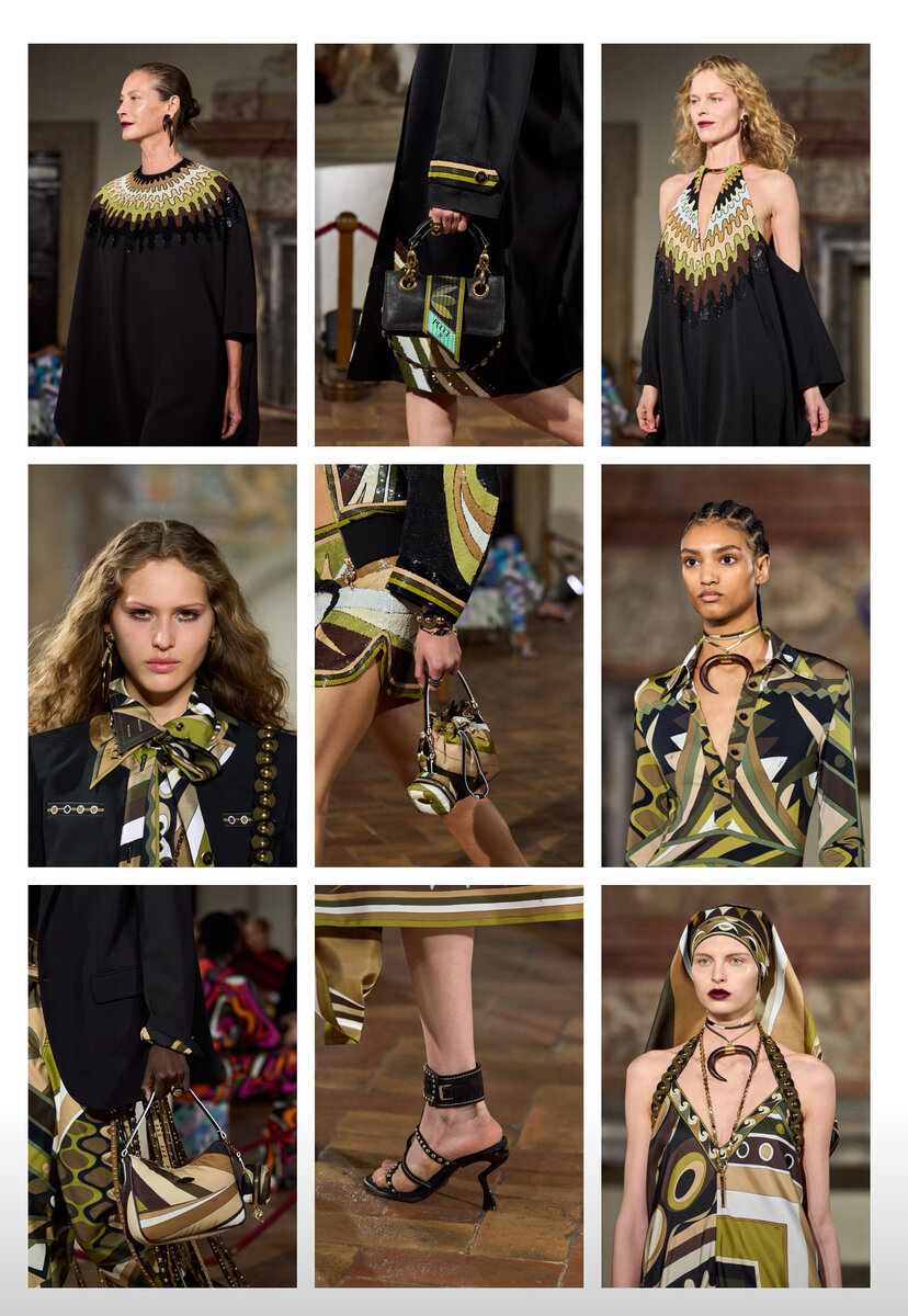 "Когда я работал на Карла Лагерфельда в Chanel", - вспоминал Мичели, "Он говорил, что носить Пуччи - это как носить полный татуаж. Так вуаля!, мы сделали татуировку". "Объединение чутья Пуччи к гламуру, его самый культовый принт 1965 года, очарование Рима и чувственность итальянских женщин à la Sophia Loren. Показ проводился в салонах с фресками Палаццо Альтемпс, аристократического особняка 16-го века, который в настоящее время является одним из мест Национального римского музея. Национальный римский музей- атмосферная рамка для современной, уверенной в себе коллекции. Сияющая Кристи Терлингтон открыла шоу в элегантном черном кафтане, вышитом на вырезе с мотивом Bersaglio с блестками. Кафтаны и накидки являются квинтэссенцией Пуччи, не только архетипом стиля высокой моды, но и формой для тела и возраста, которые Мичели охватывает в своей духе инклюзивности. Ева Герзигова и Девин Гарсия также были частью разнообразного кастинга шоу. "Семья Пуччи - это разные женщины, разные