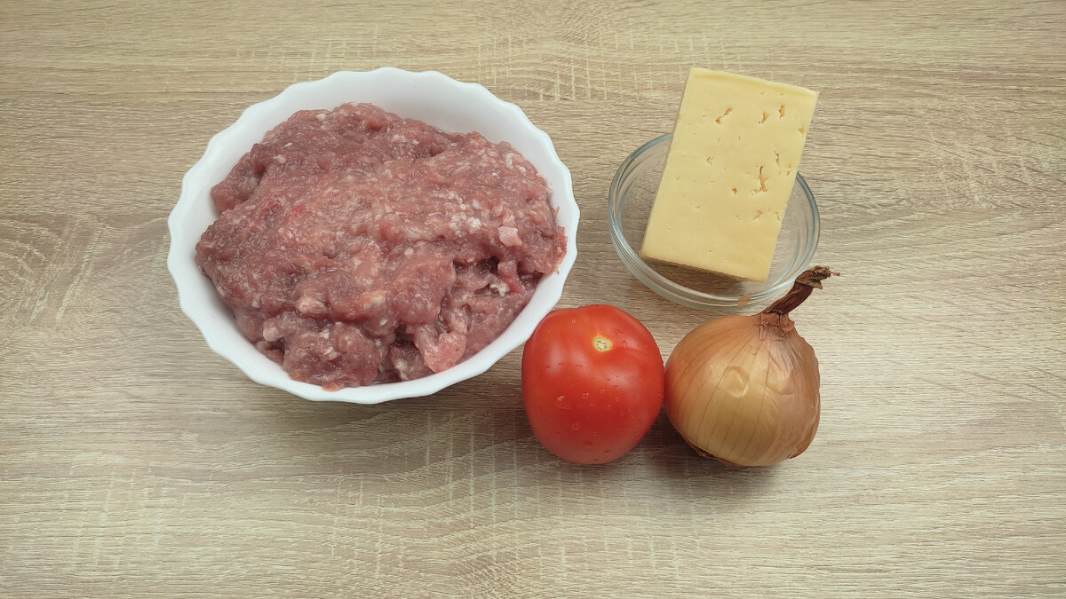 Что приготовить из фарша,когда котлеты приелись? Попробуйте сделать мясные гнезда в духовке. Блюдо лёгкое в приготовлении,но очень вкусное. Мясо тает во рту,а овощи и сыр дополнят приятным послевкусием. К такому блюду подойдет любой гарнир. А само оно прекрасно разнообразит ваше меню. Мясные гнезда в духовке отлично подойдут не только для повседневного ужина, но и станут замечательным вкусным и сытным украшением праздничного стола. Мне больше нравится готовить это блюдо со свинины фаршем. Но оно также получается очень вкусным с куриным или смешанным мясным фаршем. Готовьте и пробуйте. Вы оцените это вкусное блюдо. Ингредиенты: Фарш мясной 500 гр Лук репчатый 1-2 шт Помидоры 2 шт Сыр твердый 100 гр Майонез 3 ст.л Соль по вкусу Перец по вкусу Подготавливаем необходимые ингредиенты. У меня был готовый замороженный фарш из свинины. Я его просто разморозила. Если у вас нет готового фарша, то можно сделать его самим. Лук очищаю от шелухи и нарезаю полукольцами. Можно также нарезать лук на ме