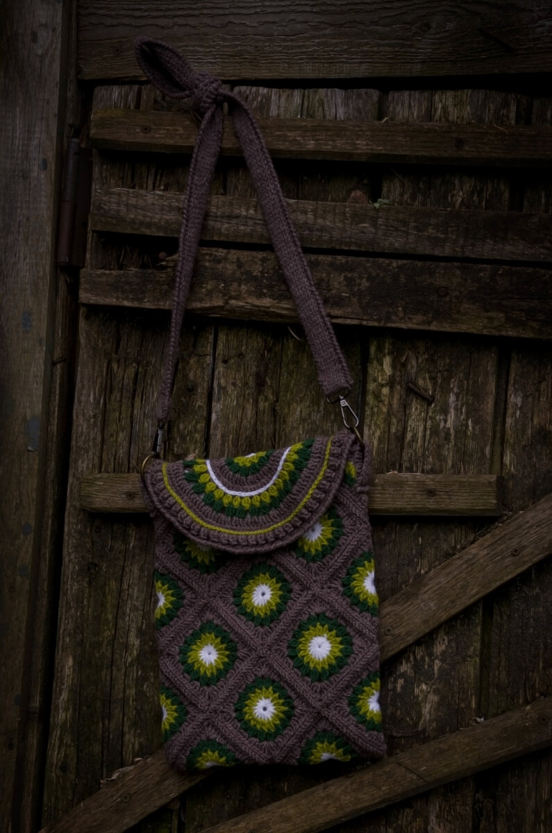 Весна для меня, как наверно и для многих, период обновления и пробуждения. И вот, пробуждаясь и собираясь с силами, залезла я в свои запасы пряжи и поняла, что так больше нельзя. С этим всем надо что-то делать. С чем?-а с запасами всего подряд. С большими и маленькими клубочками (а порой и даже с едва начатыми, почти целыми мотками) разных цветов и составов. Вдохновляясь весенними красками, подобрала сочетание из остатков пряжи. В основном полушерсть, остатки Alize Lanagold Fine (номера цветов безвозвратно утеряны,само собой), и для серединок мотивов-какой-то безымянный неизвестный белый акрил. Крючок 2,2 мм от Tulip Мотивы вязала по стандартной схеме с подсолнухом с просторов Интернета. Всего мне понадобилось 18 таких мотивов и 4 половинки в виде треугольников. Далее соединила все получившиеся квадратики и связала еще полукруг для клапана сумки. Тут уже была полная импровизация без схем и мастер-классов, просто вязала, заканчивая каждый ряд обрывом нити, чтоб все ряды были лицевыми.