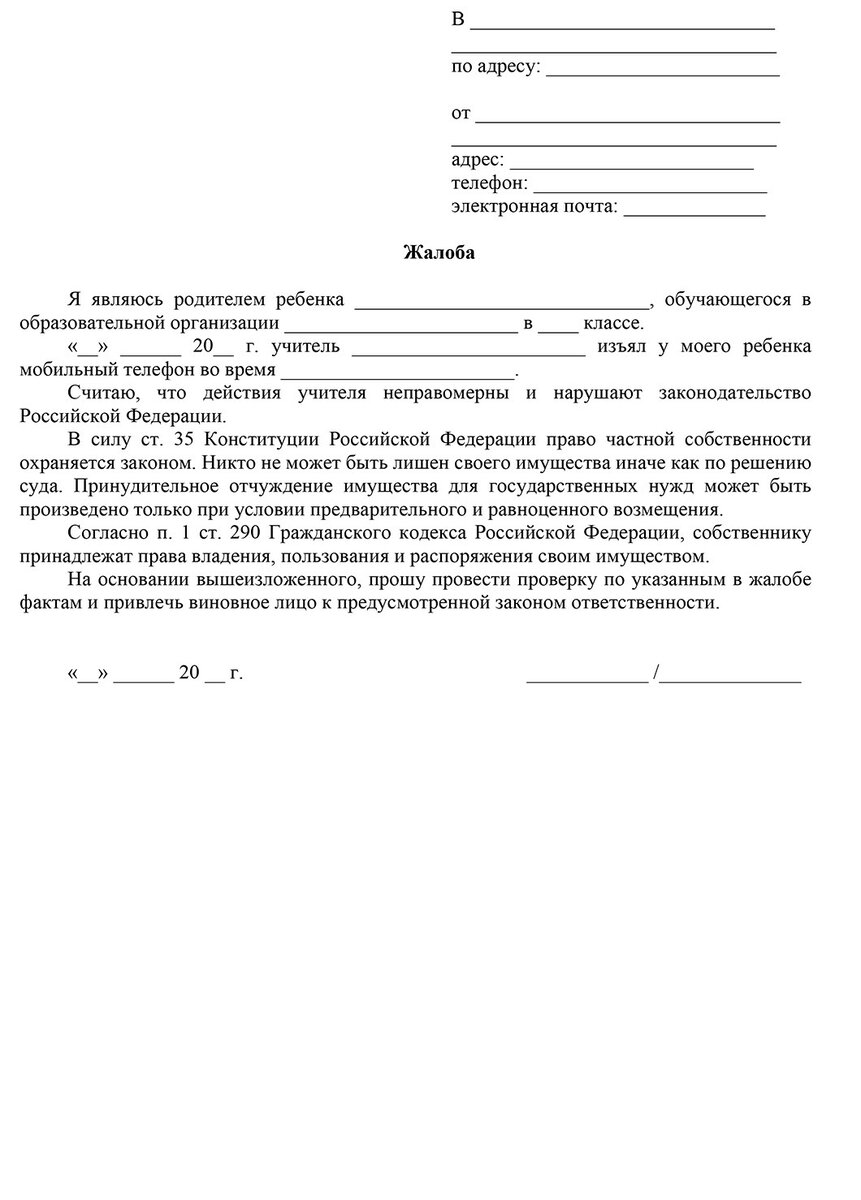 Ещё раз подчеркнём: учителя не имеют права забирать личные вещи вашего ребёнка, так как это нарушает его права. Если ваш ребёнок жалуется на незаконные действия преподавателя, вы можете составить жалобу.