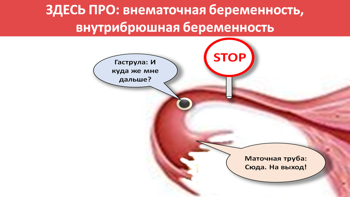 2% беременностей - внематочные. Что-то идёт не так, как в описанном мною благостном сценарии. Эмбрион прикрепляется вовсе не к стенке матки, а к другому органу. Одна из главных причин - непроходимость маточных труб, сращения-спайки в них, которые появляются из-за воспалительного процесса. Трубная беременность - вот, что может возникнуть из-за этого. Эмбрион прикрепится к стенке маточной трубы и продолжит развитие в ней. Примерно 99% внематочных беременностей - именно трубные. Понятно, чем опасен такой сценарий? Эмбрион растёт, в трубе ему становится тесно, маточная труба под его напором разрывается - большая потеря крови, смертельная опасность! И ведь никто от такого не застрахован, поэтому, милые женщины, вставайте на учёт по беременности вовремя и не отказывайтесь от УЗИ-обследования в положенные сроки. Это может спасти вам жизнь!