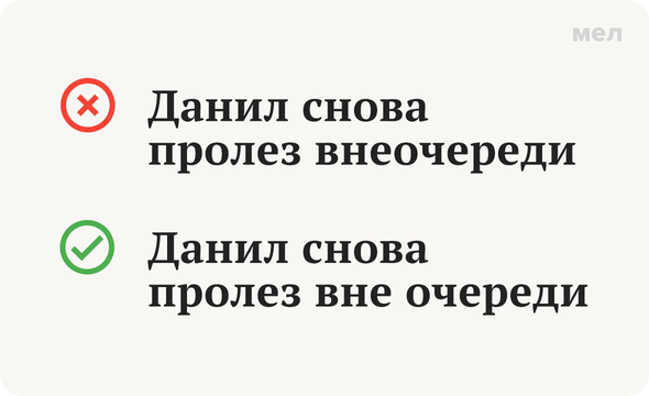 Наречия и всё, что с ними связано, — это отдельная вселенная, заблудиться в которой может и семиклассник, и кандидат наук. А слитное и раздельное написание наречий — один из самых запутанных миров этой вселенной. Потому что существуют наречия, которые вообще не отличаются от того, с чем их можно перепутать. Сложно? Дальше будет еще сложнее. Правильно: вне очереди Итак, «вне очереди» — это наречное сочетание, образованное от существительного «очередь» и отвечающее на вопрос «как?». Оно не является сочетанием существительного с предлогом, хотя очень на него похоже и существует по тем же законам (то есть пишется раздельно). Вот правило, которое регулирует его использование: наречия, образованные от существительных с предлогами, которые имеют как минимум две (чаще всего падежные) формы, пишутся раздельно. В нашем случае это: То есть существительное «очередь» в рамках наречного сочетания сохраняет способность использоваться в разных падежах. Вот еще примеры таких сочетаний: Правило очень не