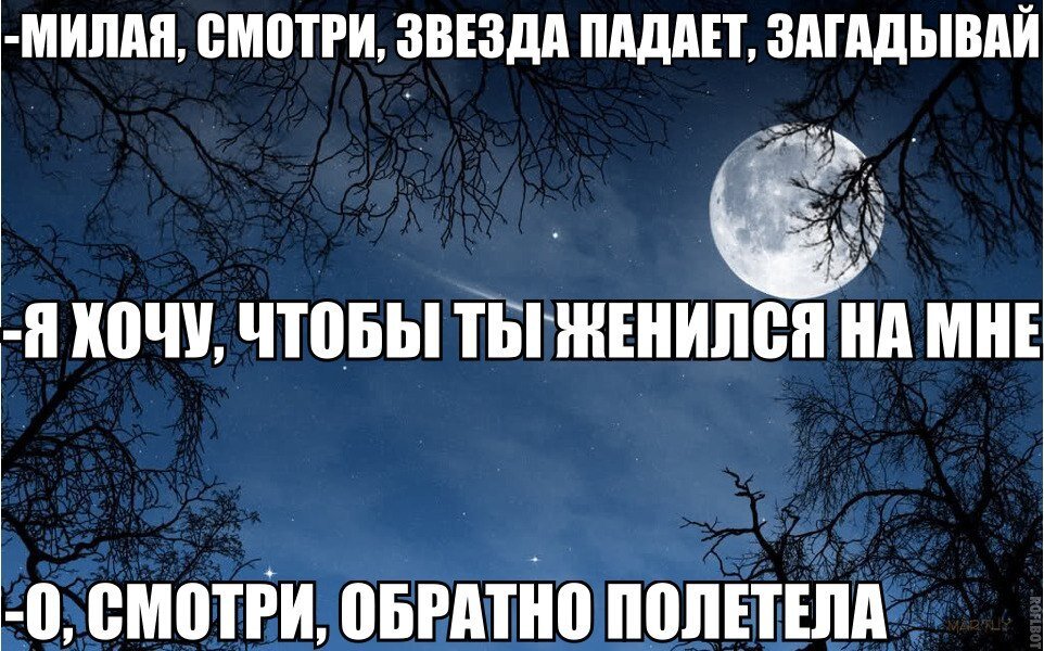 В небе загрустила Странная звезда. Всё ей здесь уныло Долгие года. Холодно и страшно. Нет совсем друзей. Все взирают важно С высоты своей. Ей хотя бы просто С кем-то поболтать, Звёзд то в небе россыпь, Только, что с них взять? Быстрые кометы С пламенным хвостом. К ним звезда с приветом А они бегом. Даже на минуту. В гости не зайдут Строго по маршруту Хвостиком махнут. Спутникам запреты От планет своих. Строгие планеты Не пускают их. В общем накопилось Грусти у звезды И она решилась Спрыгнуть с высоты. В парке с фонарями, Весело смеясь, Мы с тобой гуляли, За руки держась. Вдруг ты мне сказала В небо посмотрев "Ой, звезда упала, Загадать успел?" Не открыл, конечно, Свой тебе секрет, Только скороспешно Я ответил: "Нет". Утром на диване Вместе спали мы. Так сбылось желанье Странной той звезды.