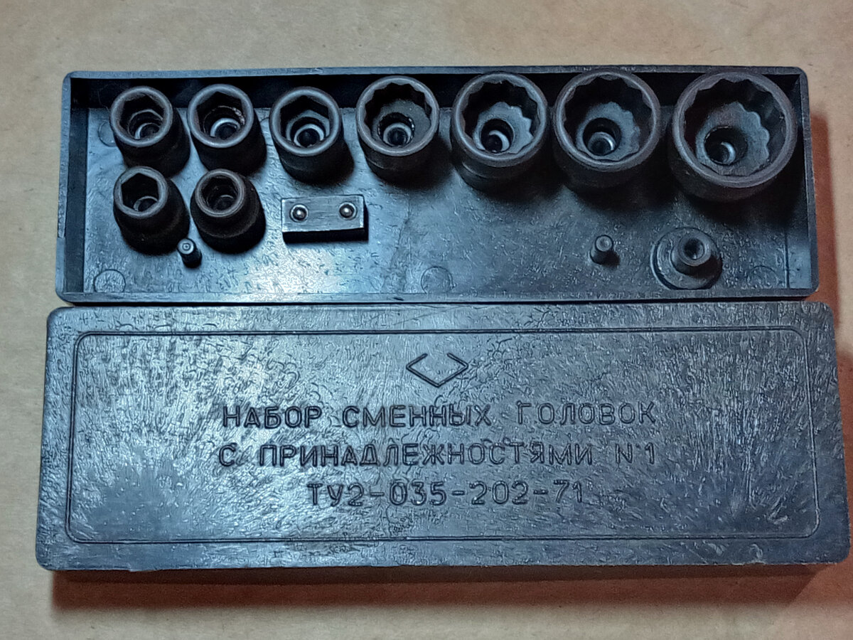 К сожалению набор некомплектный, хотя и новый, отсутствует сама трещотка, утрачен "длинный" квадрат и нет двух головок - на 13-ть и 14-ть. Но всё же решил его показать. Логотип предприятия. Город Кобрин, Брестская область, БССР, СССР. Сейчас КИЗ СИТОМО. Стоимость набора на нижней стороне пластмассового футляра.