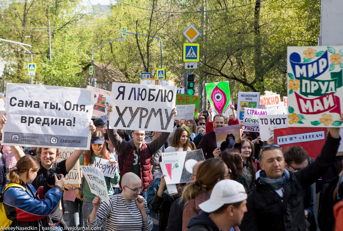 На фотографии момент единственного (если не ошибаюсь) масштабного столичного шествия под названием "Монстрация", проведенного 1 мая 2019 года. Как известно, её вдохновителем и организатором является новосибирский художник Артём Александрович Лоскутов. Однако внезапно его альтернативное творчество обрело абсолютно другую окраску. Артем Лоскутов вызвал интернет-конфликт после публикации звезды Давида в технике «дубинопись». Он уже несколько лет рисует полицейской дубинкой, обмакивая её в краску и создавая различные картины: начинал он с созданных таким образом российских флагов.