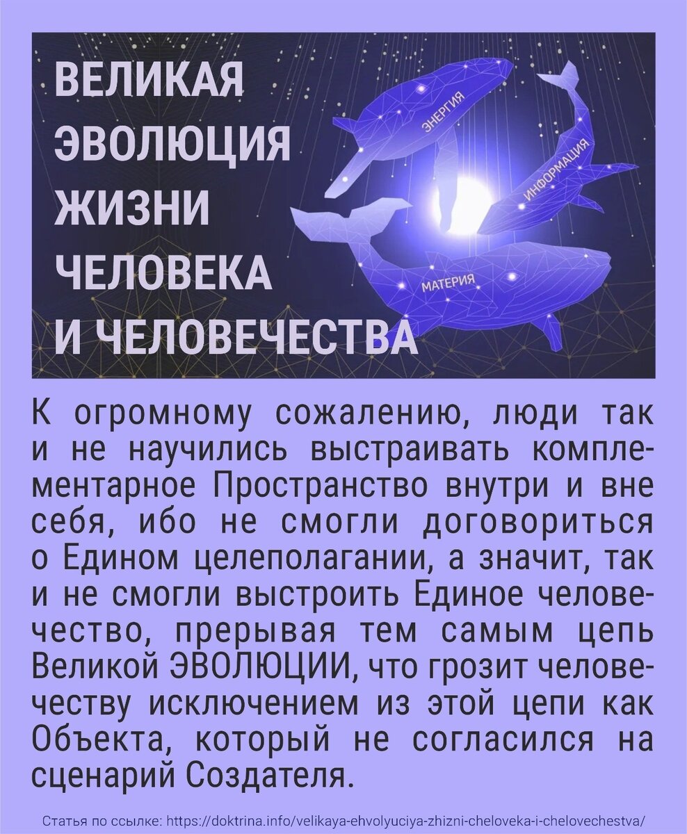 К огромному сожалению, люди так и не научились выстраивать комплементарное Пространство внутри и вне себя, ибо не смогли договориться о Едином целеполагании, а значит, так и не смогли выстроить Единое человечество, прерывая тем самым цепь Великой ЭВОЛЮЦИИ, что грозит человечеству исключением из этой цепи как Объекта, который не согласился на сценарий Создателя.