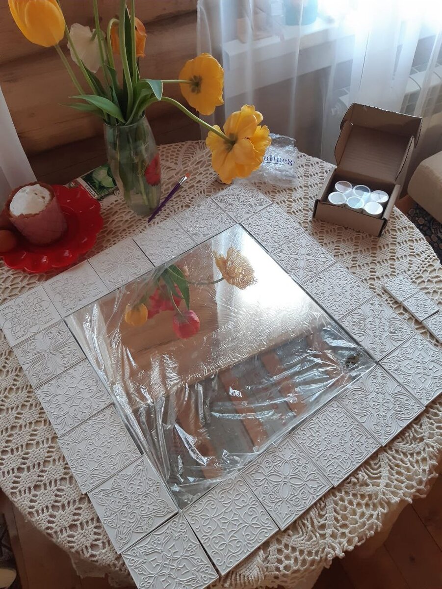 Давно хотела украсить свой дом зеркалом с изразцами. Но смущал вес данного изделия. В продаже нашла деревянные плитки 10х10х0,6 из набора для декорирования. Они изготовлены из прессованной древесной пасты и покрыты влагостойкий грунтом. Вес каждой не превышает 45 грамм. Для оформления использовала набор красок эмалей. Первый результат на подарочных плитках. 5 штук красок объемом по 20 гр хватило для оформления 20 плиток. Работа очень кропотливая и требует усидчивости. Потратила я 4 для. И вот мой долгожданный результат.