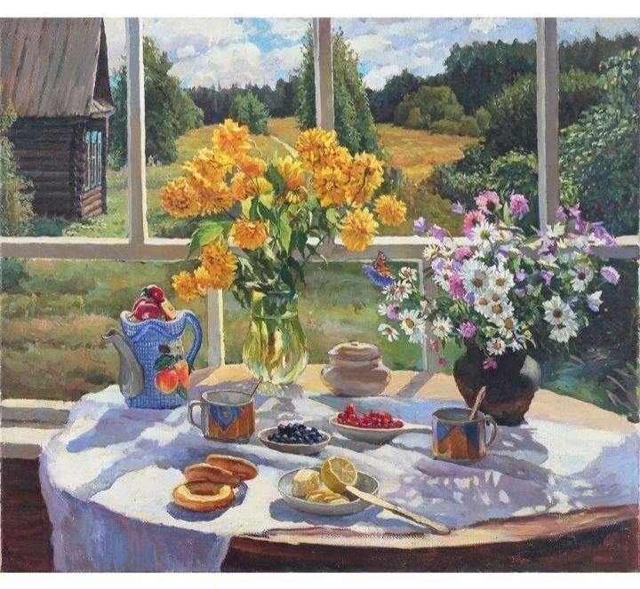 - Мгновения тишины и красоты, Душевного покоя, Мгновения радости, любви, Умиротворения земного ... Вечные - это огоньки, Мигающие светом, Большого счастья, что внутри У каждого есть человека. - Ловите светлые мгновения И разжигайте ими счастье, Погасшее к сожалению От волн уныния и ненастья. - Автор, Стулова Ольга (Катина) - Поэтическая зарисовка к картине: " Натюрморт на фоне окна " ... Современного мастера живописи и пейзажа, Алексей Митенков Автор - член творческого союза художников России и международной Федерации художников. Родился в Московской области. Вглядитесь в картину этого прекрасного художника, воспевающего красоту родного края, ценности родные. В его картины влюбляешься с первого взгляда. И когда смотришь на них, не замечаешь ничего, кроме своего внутреннего душевного отклика на уникальное творение. Это, как, если бы вдохнуть свежего ветра, полного ароматов полей и лесов. Как же хорошо там отдохнуть, посидеть за этим круглым столиком, окунуться в свежую