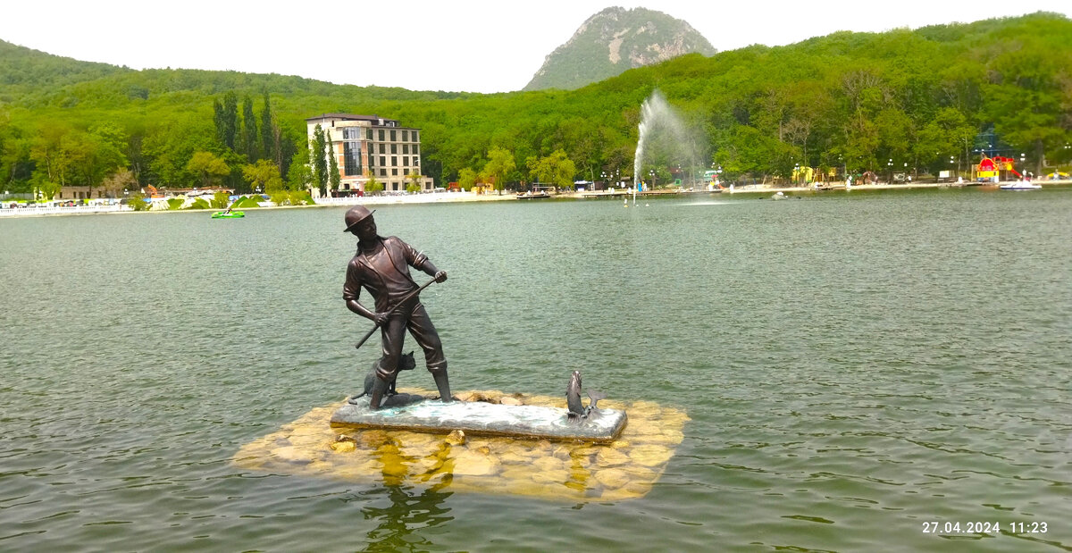 Где устанавливают памятники? Обычно на высоких постаментах устанавливают памятники известным людям, героям, но сейчас много уличной скульптуры, расположенной прямо на мостовой, без всякого постамента, что делает статуи очень естественными, правдоподобно включенными в окружающую среду. Есть памятники, расположенные очень высоко, на горе, прямо, как статуя Христа на вершине горы Корковаду в Рио-де-Жанейро. А моя недавняя поездка в КМВ, в частности в город Железноводск, привела к мысли о том, какие же есть еще статуи, установленные в воде? Скульптура «Рыбак и кот рыболов» Находится эта скульптура в Курортном озере города Железноводска. Молодой рыбак вытягивает из воды крупную рыбу, а у его ног затаился в большом напряжении кот. Котик, похоже, очень рассчитывает на эту добычу и хочет полакомиться рыбкой. Много скульптуры установлено в фонтанах, но это еще одна большая тема, я ее не буду касаться, хотя вспомню фонтан с бюветницами в Железноводске. Это красивейший светомузыкальный фонтан на
