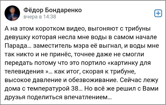 Телеграм-канал, ссылаясь на очевидцев, пишет, что ветерану стало плохо на параде. И он попросил воды, за которой побежала его помощница. Однако обратно на трибуну вернуться ей не позволил заместитель мэра города Константин Чубенко, якобы, чтобы «не портить картинку».