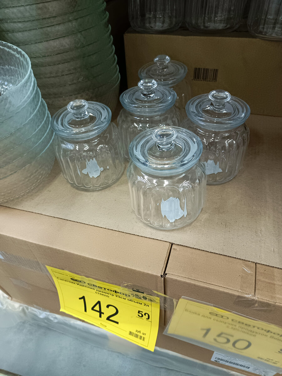 Приветствую вас, дорогие читатели и подписчики канала! За последнюю неделю в "Светофор" завезли много товаров для кухни и хозяйства, которые сразу привлекли внимание покупателей. И в этом обзоре, делюсь с вами увиденным в "Светофоре" города Крымск. Стеклянная банка с крышкой для сыпучих продуктов, объёмом 900 мл. Цена 150 рублей. Стеклянный кувшин для напитков с цветной крышкой на выбор, объёмом 1,7 литра. Цена 158 рублей. Фаянсовая кружка с позитивным декором для чая и других напитков, объёмом 360 мл. Цена 98 рублей. Стеклянная кружка с декоративной наклейкой для разных напитков, объёмом 350 мл. Цена 64 рубля. Стеклянный салатник с рельефом и волнистыми краями, диаметром 22,5 см и объёмом 1,5 литра. Цена 172 рубля. Ковш из нержавеющей стали со стеклянной крышкой и капсульным дном объёмом 2 литра, подходит для всех видов плит. Цена 488 рублей. Сотейник с толстой стенкой и антипригарным покрытием со стеклянной крышкой, диаметром 26 см. Цена 1052 рубля. Чугунная кастрюля "Гардарика" с кр