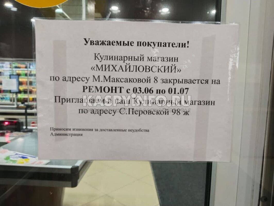 В Астрахани закрывается гастроном «Михайловский» на Марии Максаковой. Торговая точка закрывается на ремонт. Так гласит объявление, размещенное на входе в магазин.