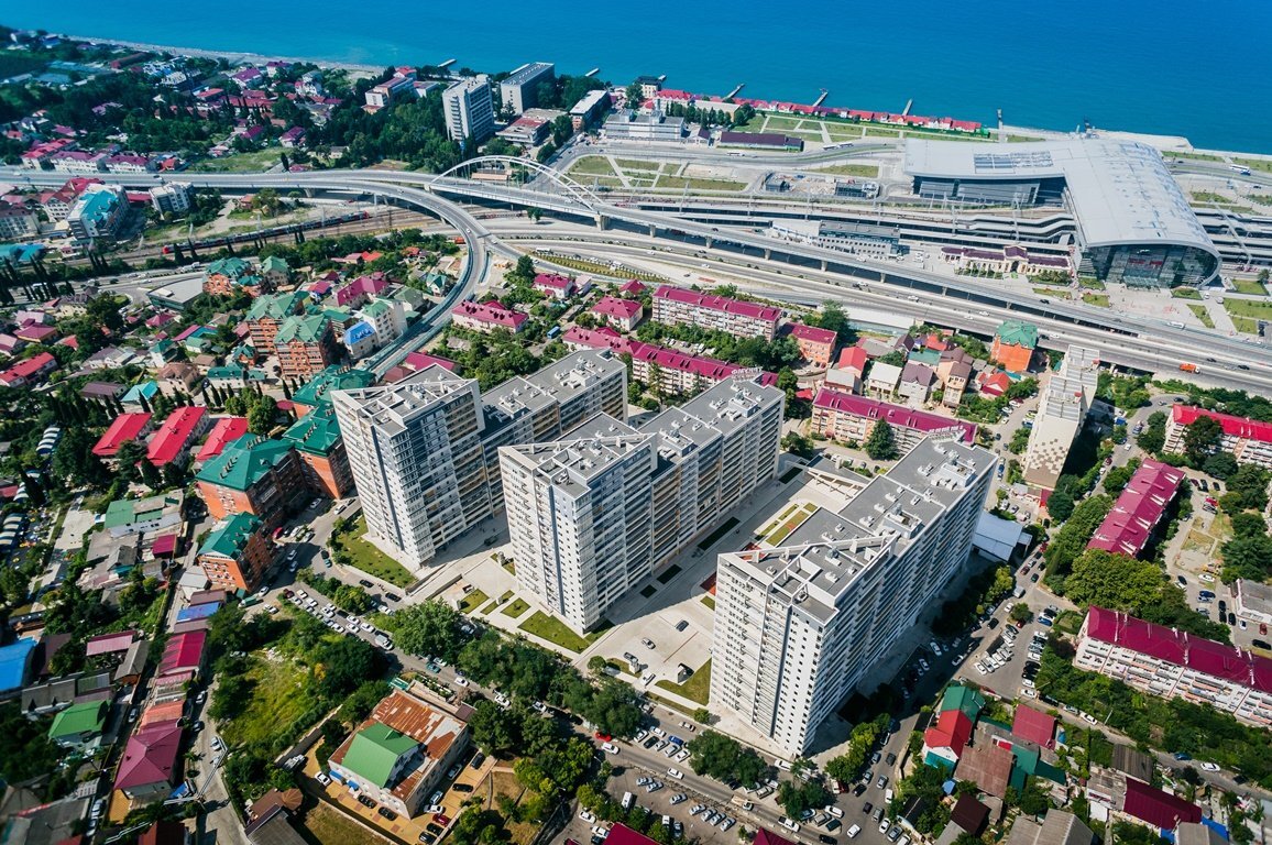 Звучит так, будто остальные комплексы могут даже не выходить на сцену. Но давайте разберёмся, за что тут такой «триумф». Комплекс построен по 214‑ФЗ, уже сдан и стоит в примерно 500 метрах от ж/д вокзала. То есть это редкий случай, когда вы можете выйти из поезда и почти сразу оказаться дома, а не в такси с фразой: «Ну мы ещё чуть‑чуть по серпантину поедем». На территории — подземный паркинг (а это в Сочи как отдельный вид роскоши) и фитнес‑клуб с бассейном. Всё как в хорошей жизни из рекламы: живёте, паркуетесь, делаете вид, что пойдёте в зал. Из корпусов открывается хороший вид на море. Не тот, где «между двумя домами, если встать на табуретку и наклониться», а нормальный, честный вид, за который обычно платят отдельно и с грустью. Теперь самое интересное — планировки.