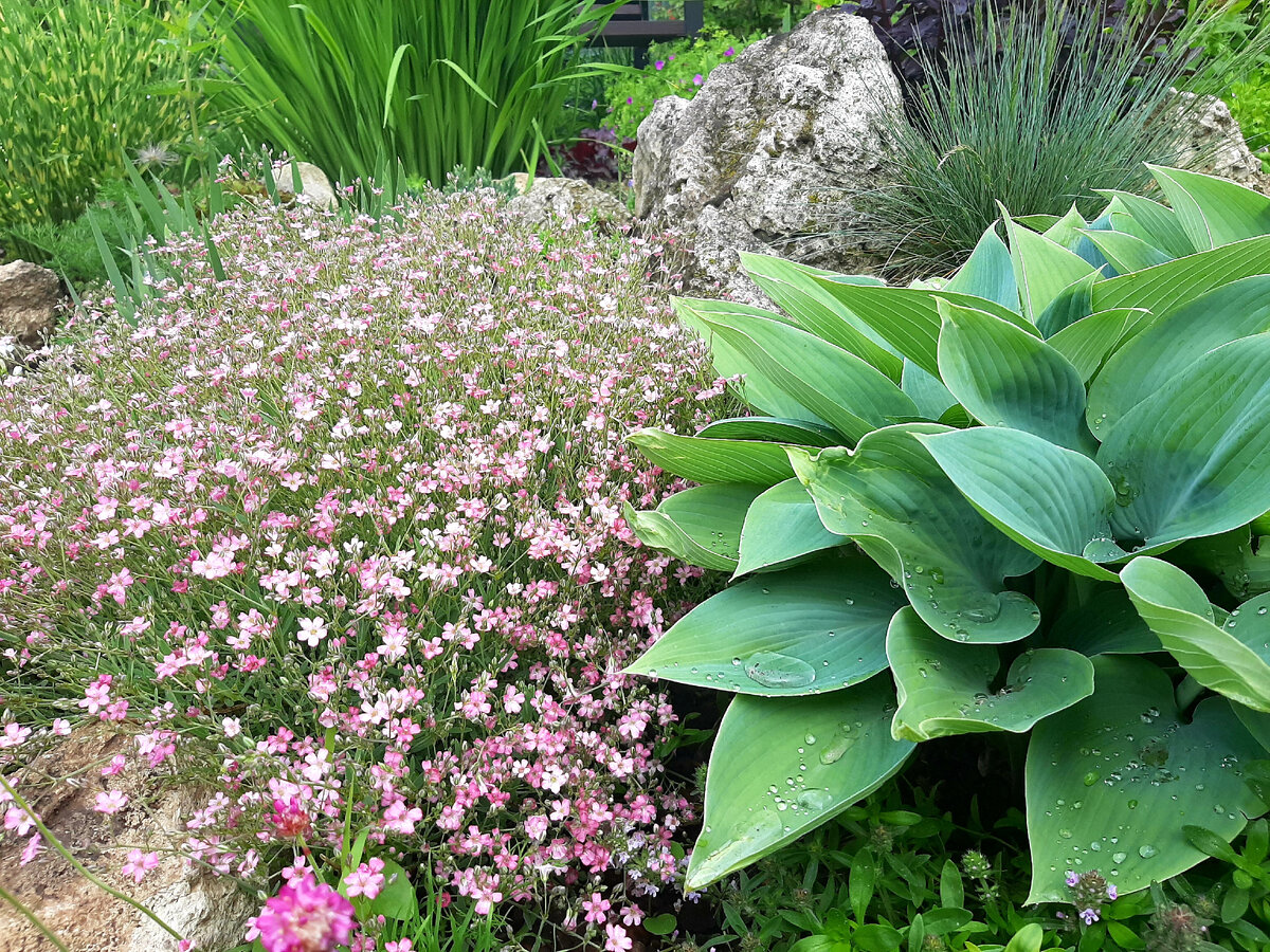 Я уже писала, что за счёт удаления старого бетонного покрытия, у меня образовались дополнительные посадочные места для растений. Увеличилась площадь трех цветников и горки. Проще всего было с горкой, ну это было предсказуемо- притащи камни, посади засухоустойчивые растения, и красота обеспечена. Не буду утверждать, что процесс заполнения новых территорий завершён, но основная масса растений уже рассажена и прижилась. На горку и купить растения оказалось самой простой и легко выполнимой задачей. Теоретически можно было обойтись своими растениями, к примеру, можно было рассадить молодило (которого у меня, как грязи) и очиток. Но я не удержалась и купила туда армерию, колокольчик и пару тимьянов. Посложнее было со старым большим цветником. Вот такую полосу нужно было засадить. Здесь я посадила в основном свои растения, по крайней мере до осени ничего больше пересаживать не буду, а там видно будет. В своих собственных «загашниках» у меня нашлись можжевельник, нивяник, герань садовая, берес