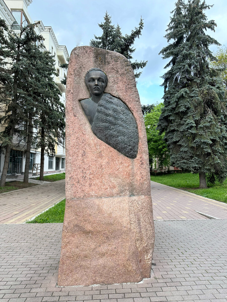 Памятник авторства скульптора Арсена Гучапшева и архитектора Аси Мидовой представляет собой трехметровую глыбу из розового гранита с бронзовым барельефом великого русского поэта в кавказской бурке. Под барельефом автограф Лермонтова.