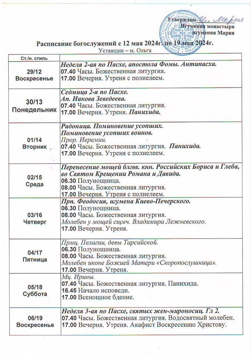 12-19.05. Расписание богослужений в Введенском женском монастыре города Иваново