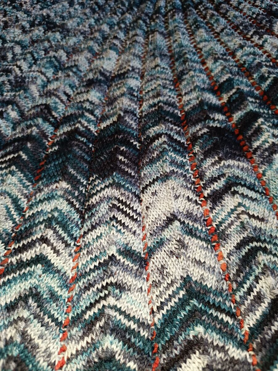 В работе 697 петель. Израсходовано уже 1200 метров (3 пасмы) пряжи. Высота 70 см. В планах 90 см или 100 см, ещё не решила. Эту идею вынашивала два года. Когда-то увидела её на Равелри. В силу обстоятельств россиянам купить описание сейчас не вариант. Пришлось импровизировать. Вяжу уже больше месяца, по вечерам выходных дней. На даче - это отдых после садовых работ. Получаю огромное удовольствие. К лету надеюсь закончить. Из-за большого количества петель один ряд привязываю довольно долго. А начинала всего с трех петелек. Схема простейшая. Между клиньями двойной накид, который в изнаночных рядах провязываюся: один лицевой, второй изнаночной. Клинья постоянно увеличиваются, шаг в начале - 8 рядов, далее от 16 до 18 смотрю как ложится вязание и варьирую. В центре клина три петли вместе в каждом втором ряду. Соответственно, чтобы расширить клин, петли нужного ряда вместе не провязываю. Итого однократная прибавка составляет 66 петель. Несложное вязание для релаксации. 33 клина.