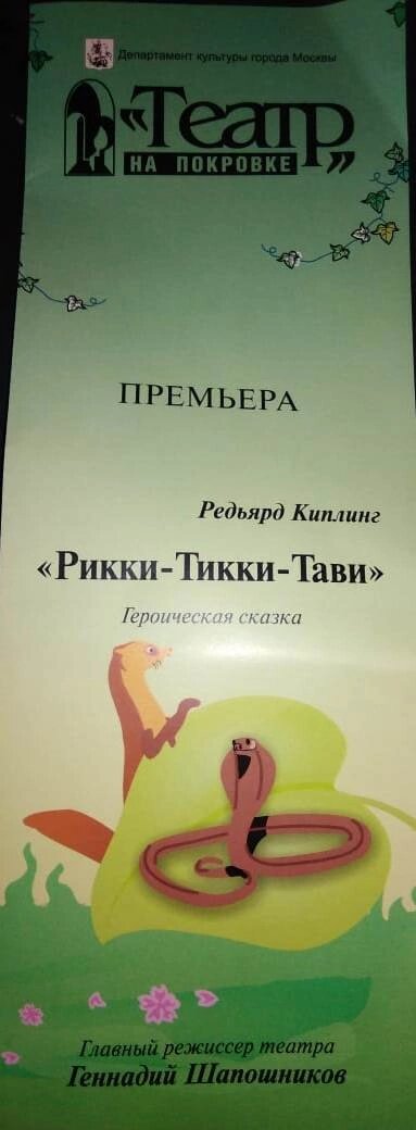 Ваши дети уже полюбили театр «На Покровке» - всегда уютный и всегда разный? Тогда самое время посмотреть спектакль по мотивам рассказа Р. Киплинга «Рикки-Тикки-Тави». История про храброго мангуста Рикки, который вместе с птичкой Дарзи и белозубкой Чучундрой спасают людей от кобр Нага и Нагайны. Это вечная история о борьбе добра и зла. Восхищает всё: акробатические этюды актеров, пластичность, имитация борьбы. А яркие образы кобр были жутковаты. Но ребята хоть и побаивались их, но смело пошли фотографироваться после спектакля. Этот спектакль сделал каждого юного зрителя отважнее, добрее и лучше. А вы помните клич мангуста: «Рикки-тикки-тикки-чик!»? До новых встреч в мире прекрасного, дорогие театралы!