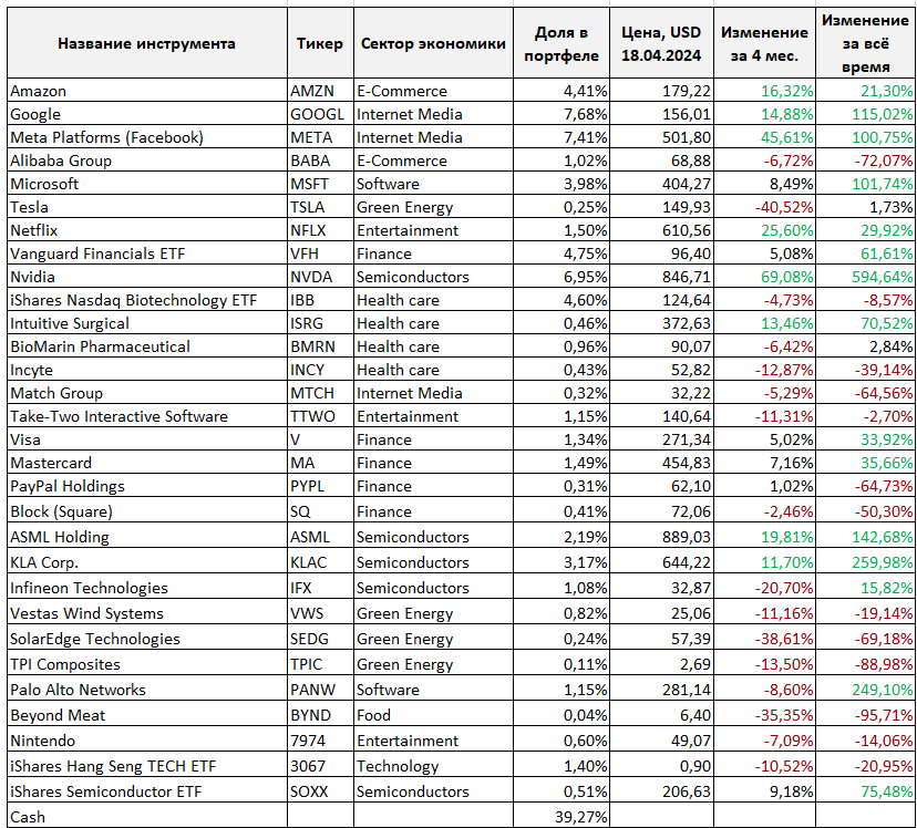 Лучший результат в портфеле за прошедшие 4 месяца у акций Nvidia, которые взлетели на 69% вслед за хайпом в искусственном интеллекте. На 2 месте бумаги Meta Platforms* с результатом +46% по тем же причинам. Наконец, на третьем месте акции Netflix, которые выросли на 26%. Худший результат у бумаг Tesla, которые за месяц обвалились на 40% вслед за замедлением роста на рынке электромобилей. Капитализация SolarEdge снизилась на 39% на фоне продолжающегося падения в секторе зелёной энергетики. Акции Beyond Meat упали на 35% на фоне дальнейшего ухудшения операционных показателей.