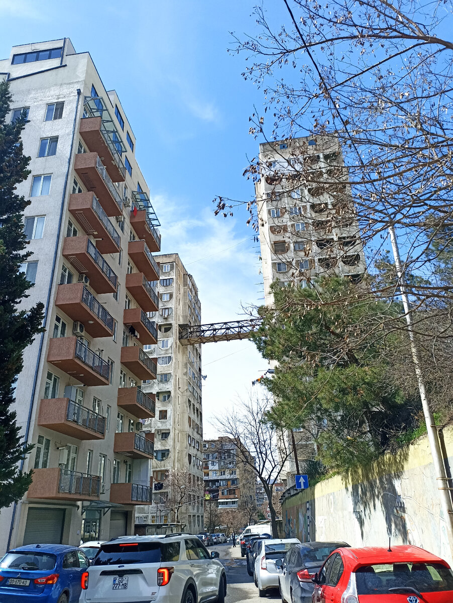 На плато Нуцубидзе находится жилой комплекс, в районе Сабуртало, его особенность - мосты между домами. Комплекс состоит из трех жилых зданий, расположенных на склоне холма и соединенных между собой пешеходным мостом. Жилой комплекс был спроектирован грузинскими архитекторами Отаром Каландаришвили и Гизо Поцхишвили, строительство велось с 1974 по 1976 год. Заходим в первое здание и платим 20 тетри (примерно 6,8 рублей) за лифт. Да, лифты в Грузии платные. Где-то монетки бросать, где-то карточки специальные, а в хороших новых комплексах оплата лифта включена в счёт, как в РФ, но, пока, последний вариант мало распространен. Бельишко сушится, это нормально. В Грузии сушат на улице, в моем детстве также было, только на общих площадках. А это фасад здания, очень жаль, но он испорчен, но тут, хотя бы, нет пристроек Вид с моста. Типичный спальный район. А это сам мост, вот такое стрёмное граффити - бич Тбилиси. Первое время, меня бесило это, сейчас привыкла . Окно в стене, там такое же груст