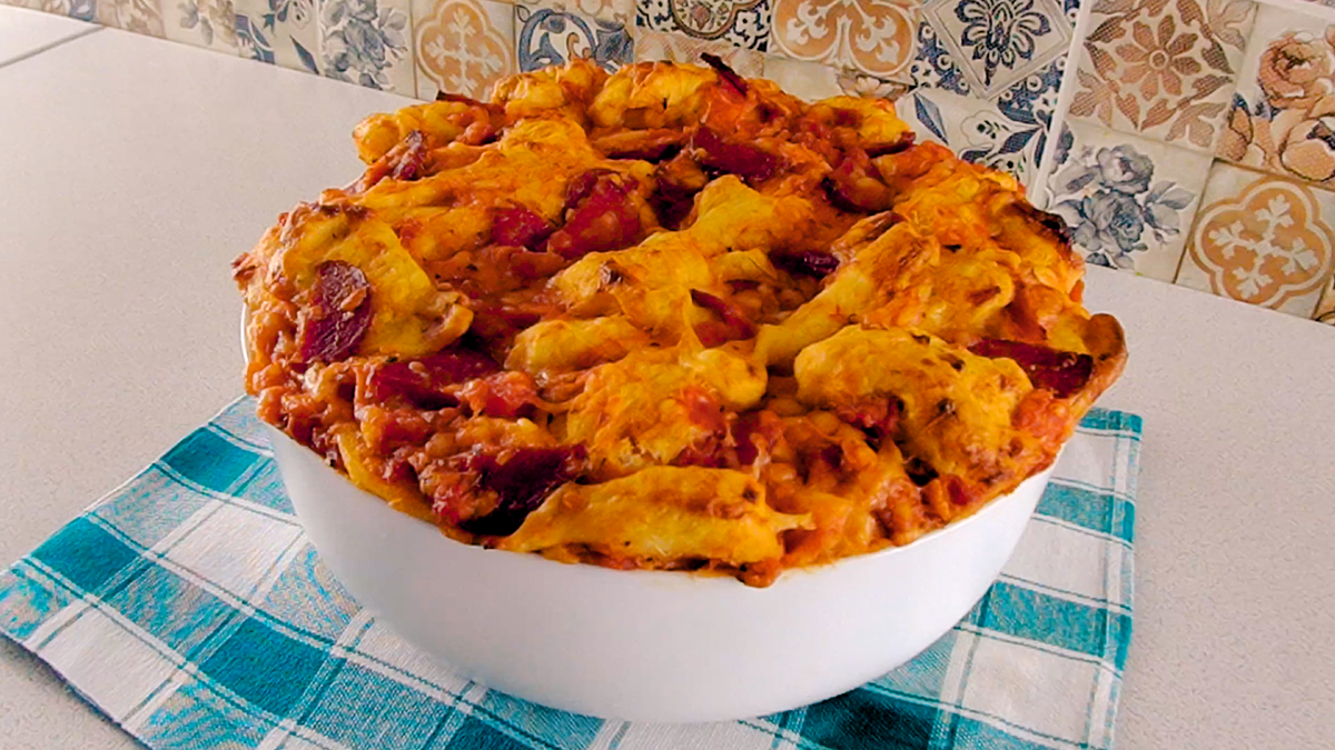 Вкусная отрывная пицца с колбасой, сыром и томатным соусом готова! Приятного аппетита!