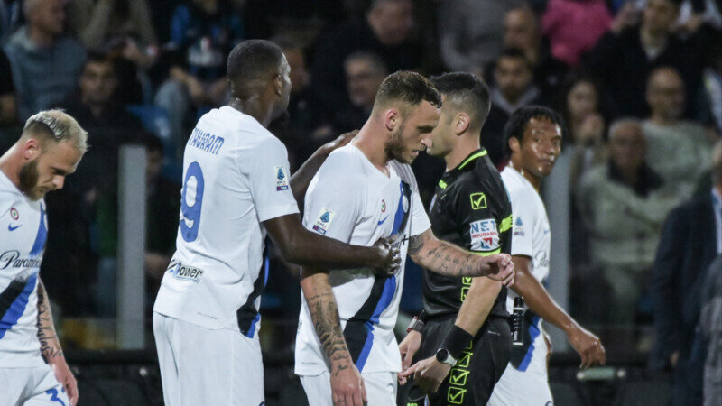 Миланский «Интер» разгромил «Фрозиноне» в гостевом матче 36‑го тура чемпионата Италии по футболу. Встреча завершилась со счетом 5:0. Голы забили Давиде Фраттези, Марко Арнаутович, Тайон Бушэнэн, Лаутаро Мартинес и Маркус Тюрам. Команда Симоне Индзаги ранее досрочно стала чемпионом Италии, команда набрала 92 очка, «Фрозиноне» (32 очка) идет 16‑м. В следующем туре 19 мая «Интер» примет «Лацио», «Фрозиноне» в этот же день сыграет на выезде с «Монцей». Прямые трансляции матчей чемпионата Италии смотрите на каналах холдинга «Матч», а также сайтах matchtv.ru и sportbox.ru. Чемпионат Италии. 2023-24. Тур 36 «Фрозиноне» (Фрозиноне) — «Интер» (Милан) — 0:5 (0:1) Голы: Фраттези, 19 (ВИДЕО). Арнаутович, 60 (ВИДЕО). Бушэнэн, 77 (ВИДЕО). Мартинес Лаутаро, 80 (ВИДЕО). Тюрам, 84 (ВИДЕО).