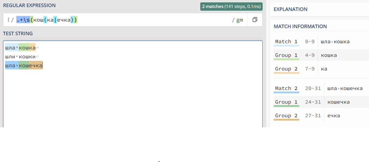 Мы прошли основы, познакомились с проверками, теперь можно опробовать и более интересные возможности регулярных выражений. Игнорирование Возьмём строки: Допустим, мы решили выделить слово "кошка" с конкретными окончаниями -"ка" и "ечка". Регулярное выражение будет следующим: .+\s(кош(ка|ечка)), где: Как видим, помимо слов с нужными окончаниями, в группы выделяются и сами окончания. Чтобы этого избежать, воспользуемся специальным ключом - (?:) ?: сигнализирует о том, что группу не следует захватывать как отдельный результат. Обращение к группе по имени В первой статье упоминалось о том, что группе можно назначить имя, но самое интересное, что по этому имени можно обратиться внутри регулярного выражения! Синтаксис (?&ИМЯ_ГРУППЫ). Это жуть какая удобная вещь при работе с крупными регулярными выражениями, так как изменение номера группы - обычное дело! Вести подсчет и каждый раз вносить правки становится неловкой рутиной. Работа с именами и обращение по ним снимает с нас эту головную бол